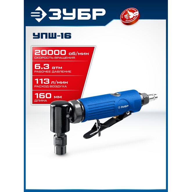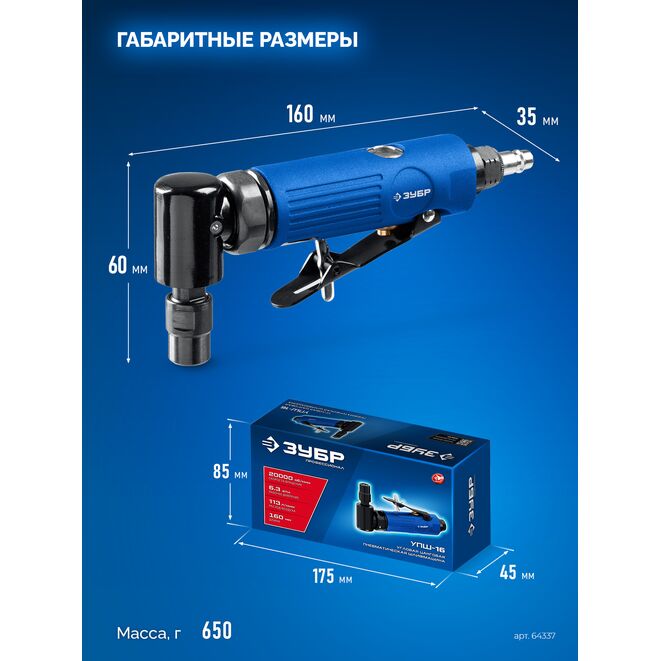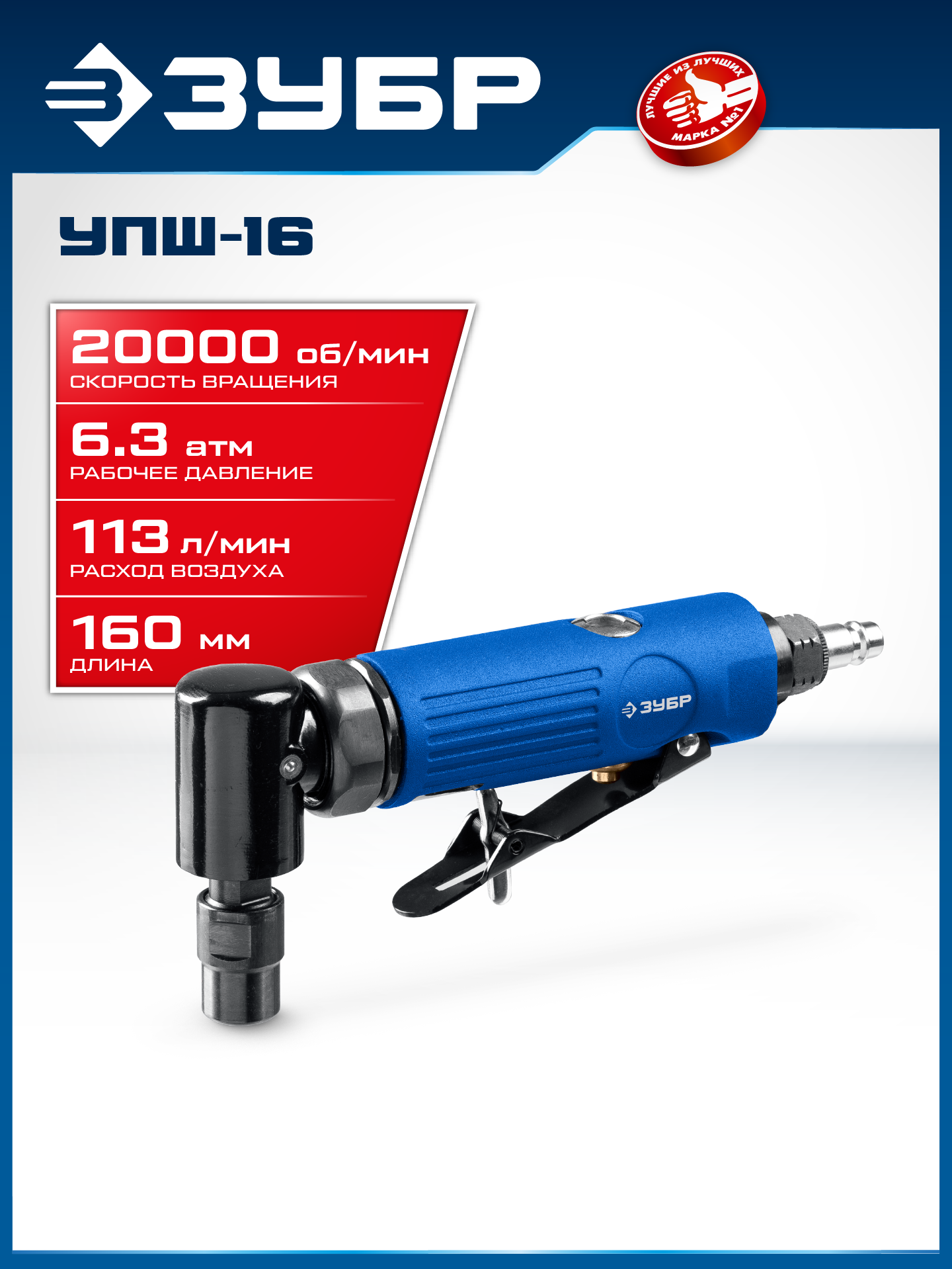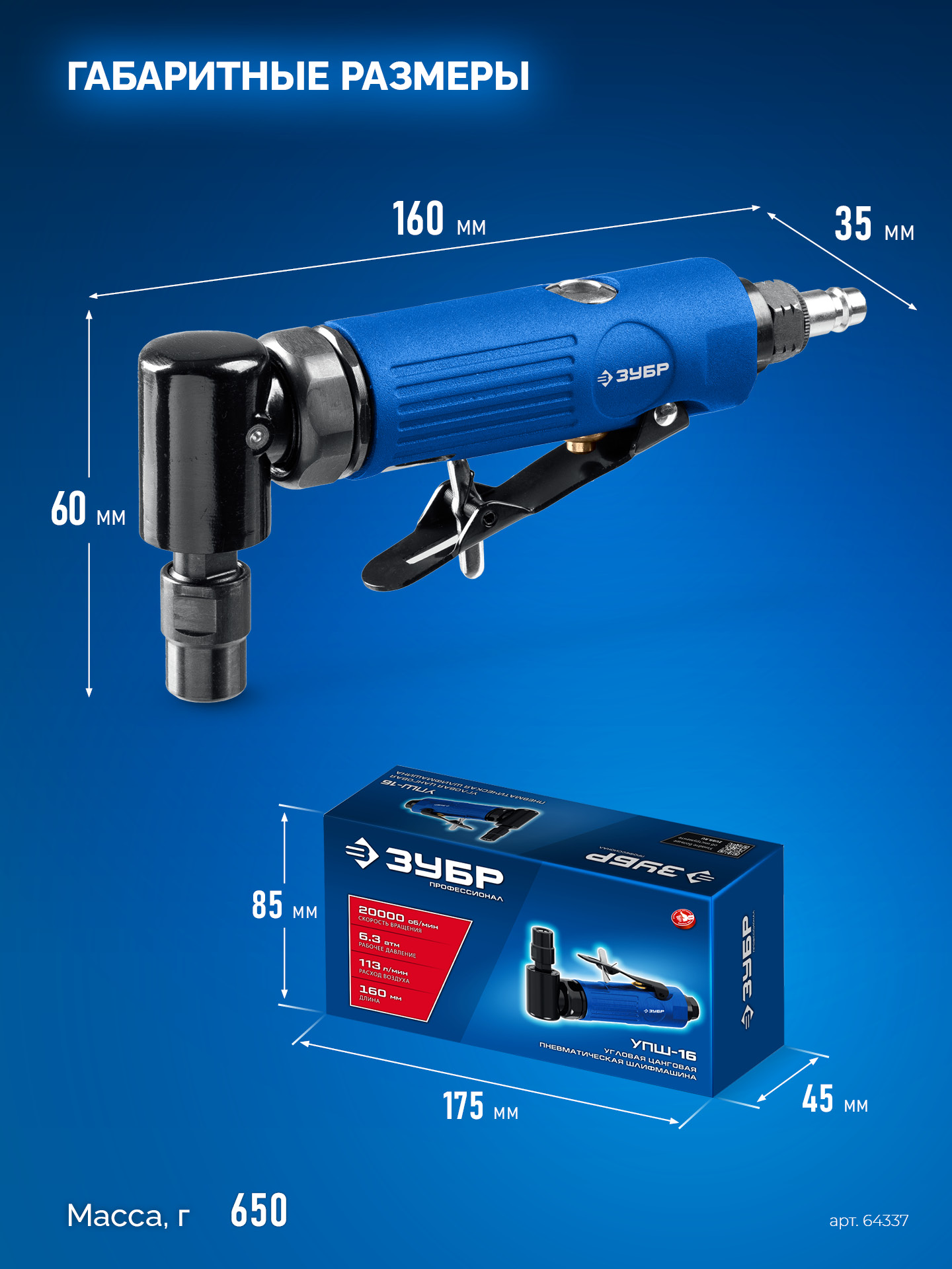 Пневматическая угловая шлифмашина ЗУБР 64337, предназначена для шлифовальных работ в труднодоступных местах.Характеристики ЗУБР 64337: