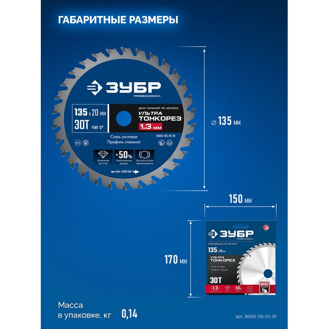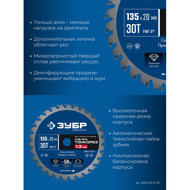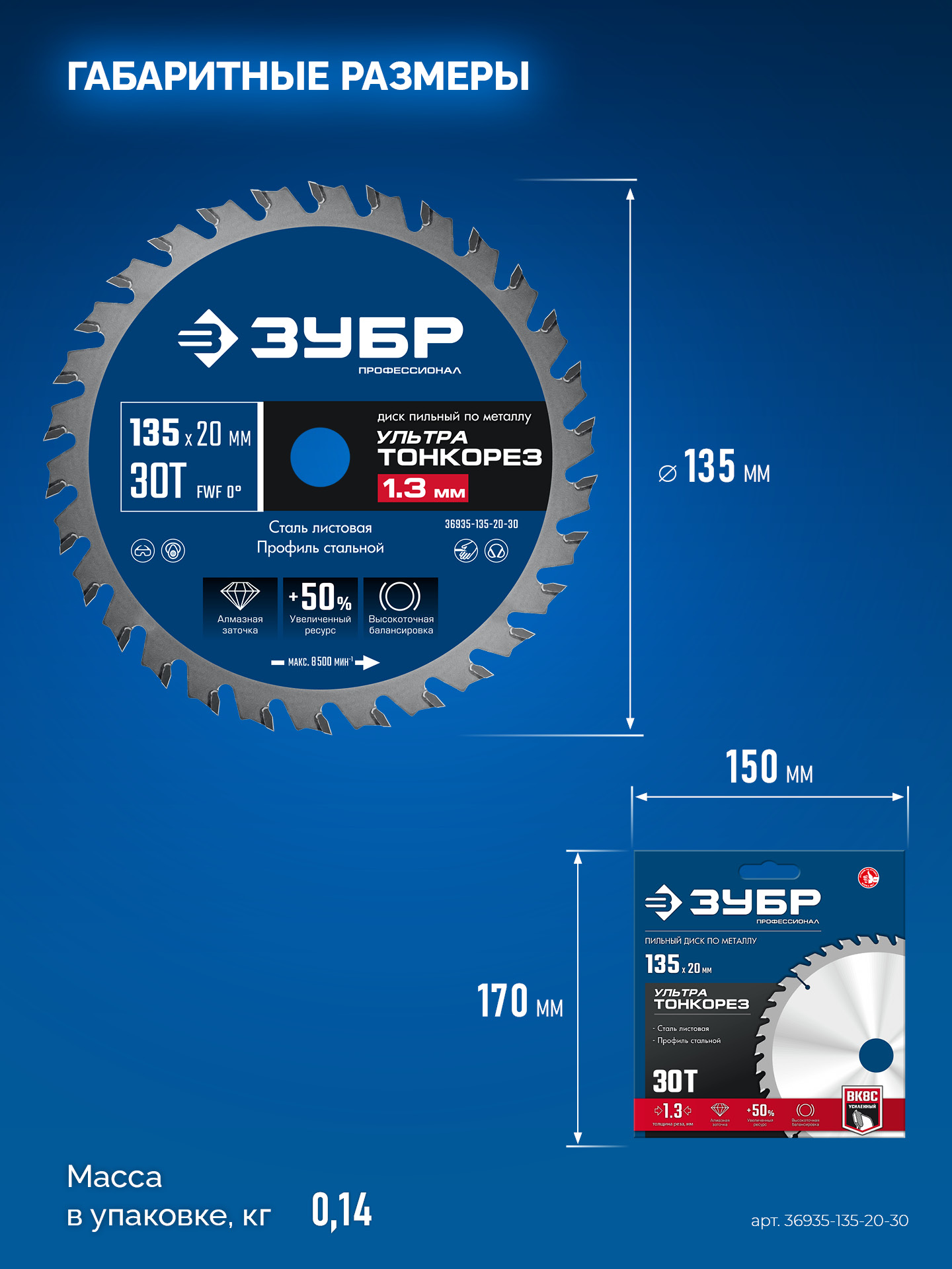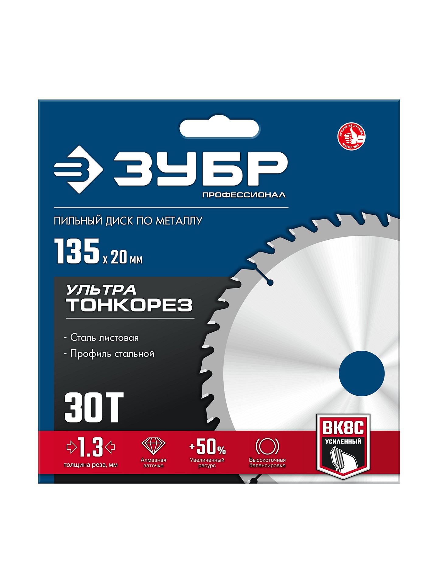 ЗУБР Ультра Тонкорез 135 х 20 x 1.3 мм, 30Т, диск пильный тонкий рез металла, Профессионал (36935-135-20-30)