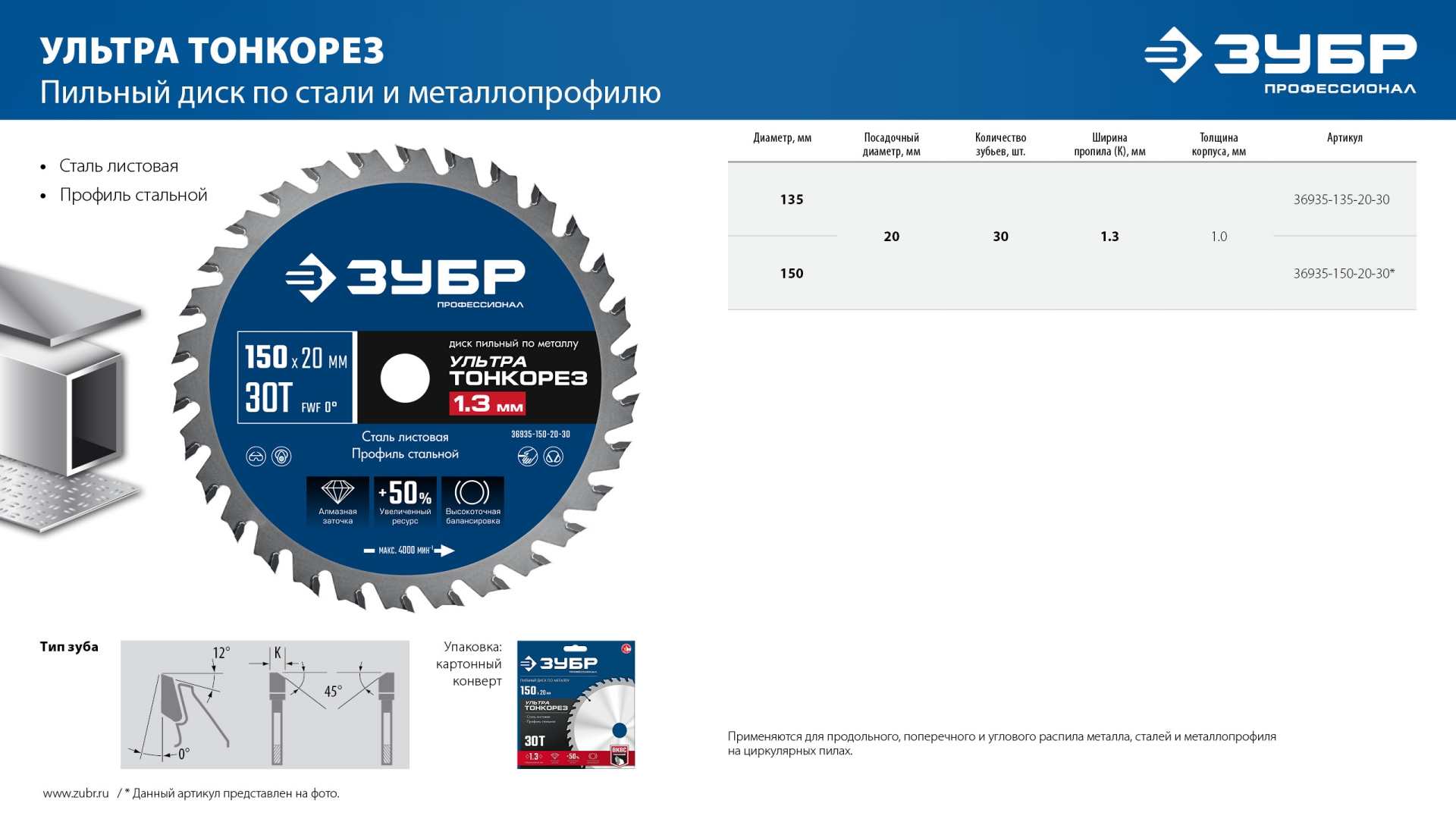 Пильный диск по металлу ЗУБР 36935-135-20-30, используется для продольного, поперечного и углового распила металла, сталей и металлопрофиля на циркулярных, торцовочных и станковых пилах.