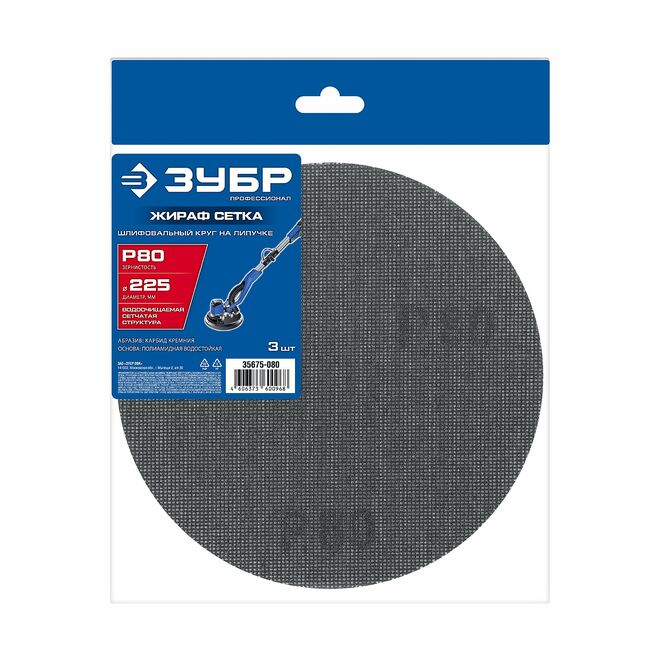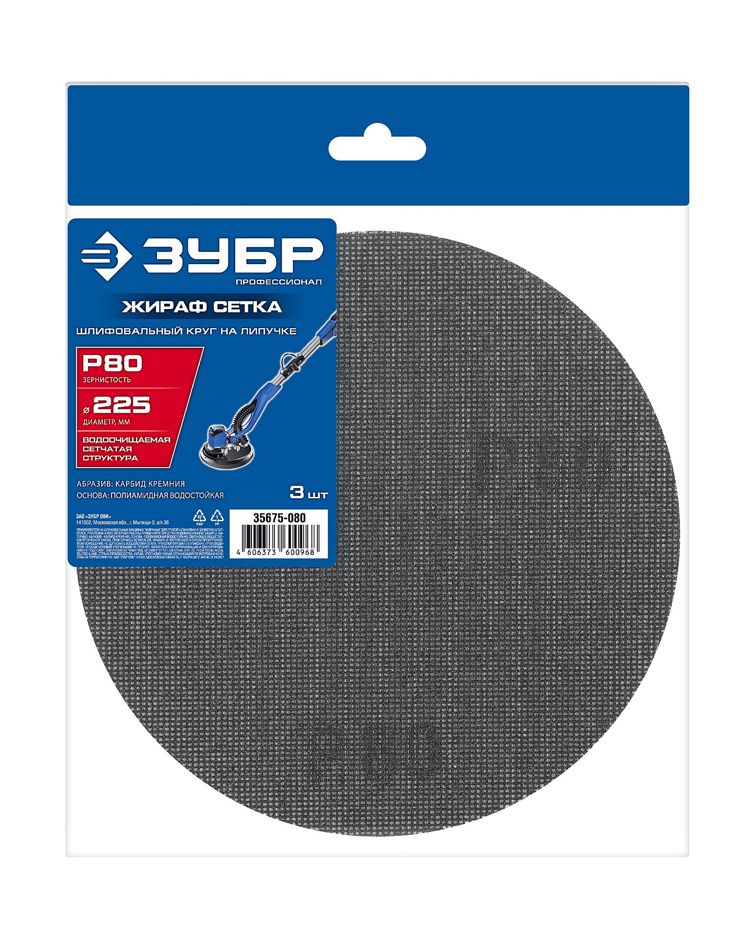 ЗУБР Жираф СЕТКА 225 мм, Р80, сетчатый шлифовальный круг на липучке, 3 шт., Профессионал (35675-080)